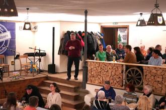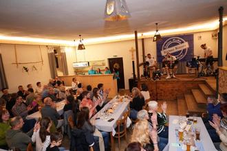 Die drei Barbaren sind Peter „Beda“ Greiner, genannt „Das kleine Wesen“, der in Görnitz aufgewachsen ist. Der Zweite im Barbarenbunde ist „das bärtige Monster“ Christian „Weiti“ Witt, eigentlich aus Botzersreuth und so wie Greiner in Weiden wohnend. Stephan „Rosi“ Rosner, der in Albersrieth knapp drei Kilometer von der Waldthurner Verräterklause residierende Flosser, nennt sich die „Bestie mit dem großen Maul“. Auf der kleinen Bühne war an diesem Abend ständige Bewegung angesagt, die drei Hauptprotagonisten wechselten ständig bei ihren sprachlichen und musikalischen Überlegungen, welchen Titel sie in ihr neue Programm aufnehmen könnten vielerlei Instrumente, angefangen von der Gitarre über Keybord bis zur Melodika und Cajon. Das Publikum, welches nach Rosis Vermutungen nur so zahlreich nach Waldthurn in den Saal gekommen war, weil das Konzert „eintrittsfrei“ war, begleitete das Barbari Bavarii beim „Song writing – Prozess“ für ihr fünftes Album nach 16 Jahren ihres künstlerischen barbarischen Schaffens.