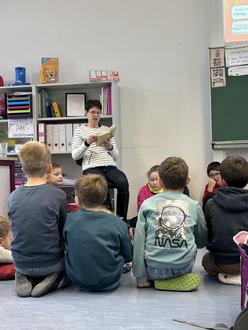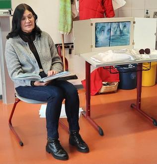 Die Leiterin der Pfarr- und Gemeindebücherei Waldthurn, Cornelia Greiner-Braun beim Vorlesetag in der Grundschule
