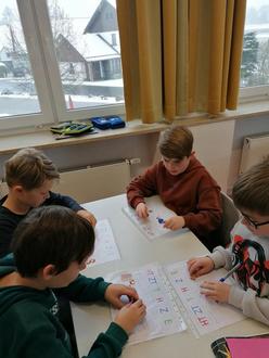Mit Hilfe einer Stellenwerttafel und farbigen Muggelsteinen machten die Kinder grundlegende Zahlbegriffe sichtbar und begreifbar. Jede Stelle – Tausender, Hunderter, Zehner und Einer – wurde durch passende Steine belegt. Die Kinder legten verschiedene Zahlen, tauschten Steine aus und erklärten einander, welche Zahl sie dargestellt hatten. So wurde nicht nur das Verständnis für Stellenwerte gestärkt, sondern auch die korrekte Benennung großer Zahlen weiter geübt.