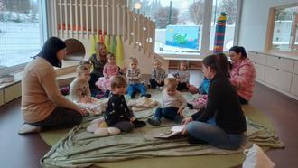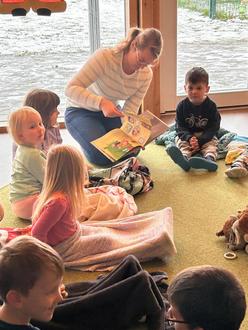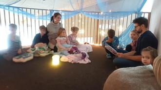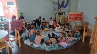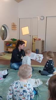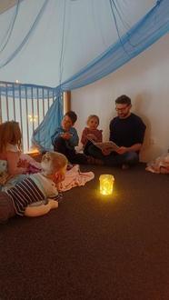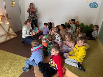 Dieses Zitat bewahrheitete sich, als es im Zuge der Ausstellung noch zwei Vorlesevormittage gab, die vom Elternbeirat ausgerichtet wurden. Mit Lieblingskissen und Kuscheldecke ausgestattet, lauschten die Kleinen den Geschichten in ihren einzelnen Gruppen.