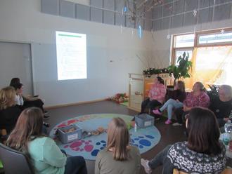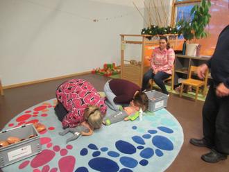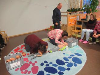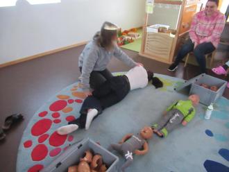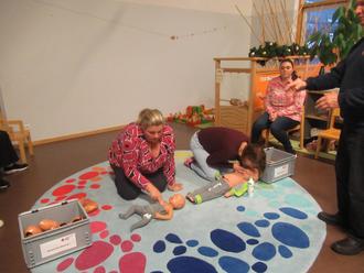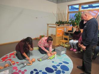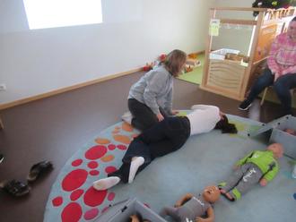 Das pädagogische Personal der Kindertagesstätte St. Josef ließ sich am Montag, den 24. November, von Herrn Franz Rath vom Bayerischen Roten Kreuz fit in Erster Hilfe machen. In einem 1 ½ - stündigen Lehrgang wurde neben theoretischen Inhalten, welche sich vermehrt auf das Handeln an Kindern und Kleinkindern bezogen, auch die Wiederbelebung an Reanimationspuppen praktisch geübt. Die Rettungspuppen waren dem Körperbau eines Kindes, sowie eines Kleinkindes nachempfunden. Herr Rath betonte mehrmals an diesem lehrreichen Nachmittag, dass es in der ersten Hilfe bei Kindern einige Unterschiede zu erwachsenen Personen gibt: „Kinder sind keine kleinen Erwachsenen!“ Seinen Vortrag ergänzte er mit Beispielen aus der Praxis, um so manches Szenario verständlicher zu machen.