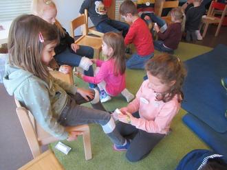 Die Schulanfänger lernten spielerisch Gefahren im Alltag zu erkennen und auch wie man andere Kinder vor einer Gefahr warnen kann. „Stopp, dass darf man nicht“ ist der wichtigste Satz. Die Schulanfänger übten auch wie man ein Pflaster richtig aufklebt, wie man eine Schürfwunde am Knie verbindet und einiges mehr. „Welche Nummer soll man anrufen, wenn ich Hilfe brauche?“ Natürlich den Notruf 112. Diese Nummer kannten alle Schulanfänger bereits.