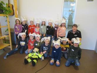Zum Schluss gab es ein Abschiedsfoto mit Kerstin, dem Willi und allen Schulanfängern. Als Erinnerung bekamen die tapferen kleinen Helden eine Urkunde und ein Käppi mit der Aufschrift „Keiner ist zu klein, um Helfer zu sein!“