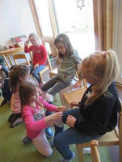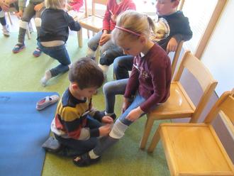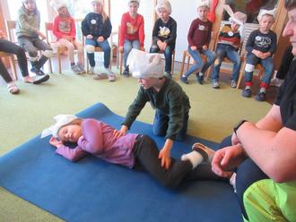 Zu Letzt übten die Vorschulkinder das wichtigste was Leben retten kann: Die stabile Seitenlage - für die Kinder auch die „Kitzellage“ genannt. Erstmal unter einer Achsel kitzeln,