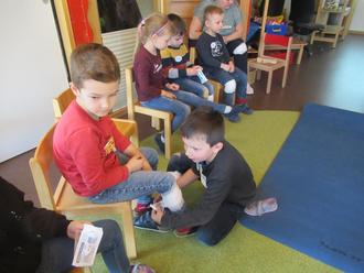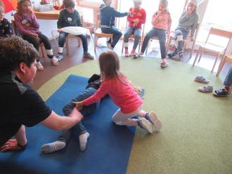 den anderen Arm an die Wange legen und mit einem kleinen Schubs auf die Seite drehen, lautete die Anleitung. Weiter muss man kontrollieren, ob der Mund offen ist und Ruhe bewahren – dazu die Worte „Alles wird wieder gut.“ Dass es nicht schwierig ist, durften die Vorschulkinder spielerisch selber ausprobieren.