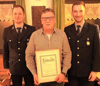 Josef Schwab (Mitte) ist der neue Ehrenvorsitzende der Feuerwehr Spielberg. Die Laudatio hält 2. Vorsitzender Josef Stangl (links). Vorsitzender Thomas Schwab überreicht die Ehrenurkunde.
