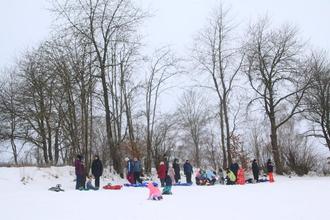Pünktlich um 14 Uhr setzte reger Betrieb ein. Über kleine, verschneite Trampelpfade erreichten die Familien „das provisorische Wintersportgebiet“ am Ortsende von Waldthurn. Von allen Seiten strömten Eltern mit ihren Kindern herbei, Schlitten unterm Arm oder gezogen, begleitet von erwartungsfroher Vorfreude.