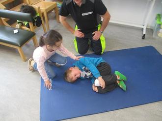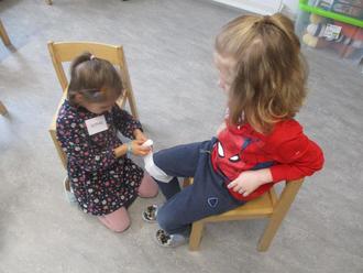 Mit viel Einfühlungsvermögen, Humor und anschaulichen Materialien führte Frau Ehemann mit der Handpuppe „Willi“ die Kinder Schritt für Schritt an Themen heran, die sonst oft nur Erwachsenen vermittelt werden. Die Vorschulkinder lernten, wie man einen Notruf absetzt, warum es wichtig ist, ruhig zu bleiben, und wie man einem verletzten Freund helfen kann. Besonders begeistert waren die Kinder, als sie selbst Verbände anlegen durften. Durch kleine Rollenspiele konnten die Kinder ausprobieren, wie sie in einer Notfallsituation reagieren würden. Dabei wurde viel gelacht, ausprobiert und gelernt. Die spielerische Herangehensweise half den Kindern, Berührungsängste abzubauen und Selbstvertrauen zu gewinnen.