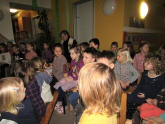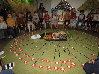 Mit dem Lied „Pass auf kleines Auge was du siehst“ stimmte Pfarrer Norbert Götz die Mädchen und Jungen auf die Andacht ein. Diese hatten zum Fest der Darstellung des Herrn – auch Lichtmess genannt – eine wunderschöne Legearbeit in der Mitte gestaltet. Die Kinder hörten im Vorfeld von den Erzieherinnen „Maria Lichtmess“ und die Legende über das Leben und Wirken des Bischofs Blasius. Eine Mutter bat den Arzt und Bischof Blasius um Heilung ihres Jungen, denn dieser hatte eine Fischgräte verschluckt und drohte zu ersticken. Durch Gebete und sein beherztes Eingreifen heilte Blasius den Jungen.