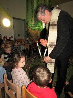 Und so erbat Herr Pfarrer Götz den Segen Gottes mit dem Spruch: “Auf die Fürsprache des heiligen Blasius bewahre dich der Herr vor Halskrankheit und allem Bösen. Es segne dich Gott der Vater, der Sohn und der Heilige Geist.“ Dazu hielt er zwei gekreuzte Kerzen vor die Kinder. Jedes Kind bekam zu diesem Fest eine Kerze mit nach Hause. Mit dem Lied „Viele Kerzen jetzt leuchten“ endete diese Andacht in der Kita.