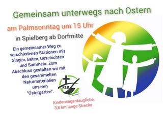 findet am Palmsonntag, 2. April 2023 um 15 Uhr ein „Gemeinsamer Weg“ statt. In der Dorfmitte von Spielberg startet dieser gemeinsame Weg zu verschiedenen Stationen mit Singen, Beten, Geschichten und Sammeln. Zum Abschluss wird mit den gesammelten Naturmaterialien „unser Ostergarten“ gestaltet. Die „kinderwagentaugliche“ Strecke ist 3,8 km lang. Einladung an Alle!