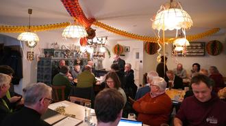 Selten dürfte die Sängergruppe Floß ihre Jahreshauptversammlung in so uriger Umgebung, bei dem die Vorstandschaft rund um einen „kuscheligen“ Kachelofen sitzt, abgehalten haben.