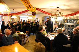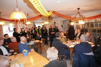 Bernhard Unger (Mitte) begrüßt zusammen mit dem Chor tonArt die Gäste der Sängergruppe Floß im Gasthaus Kühnhauser in Waldthurn