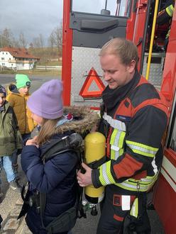 Jonas Beierl legte für die Kinder sein Atemschutzgerät an und zeigte so, wie die Feuerwehrleute im Brandfall atmen können ohne eine Rauchvergiftung zu bekommen.