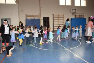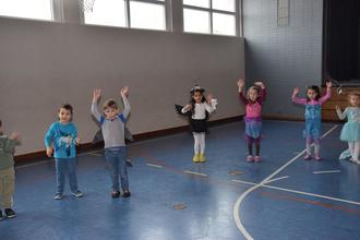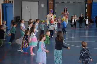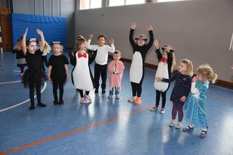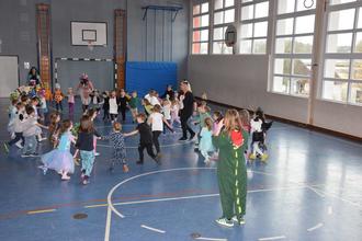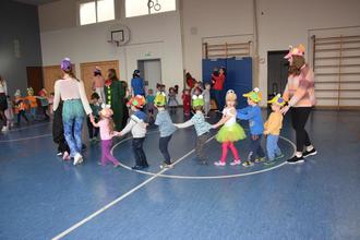 Gemeinsam wurde dann auch in den Gruppen zu Mittag gegessen – „Pasta a lá Ozean“ und die bunten Eiszapfen haben allen richtig gut geschmeckt. Bevor der große Faschingstag endete, traf man sich erneut in der Turnhalle. Mit einer langen Polonäse zog man dann von dort durch die Einrichtung zur Eingangstür, um eine Runde über den Vorplatz zu marschieren und dann mit den Eltern nach Hause zu gehen.