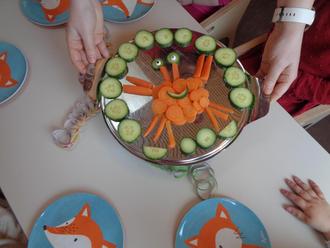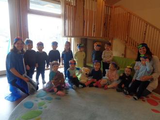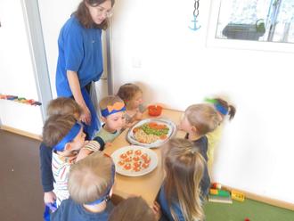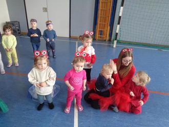 Die Kinder der Raupengruppe waren als Fische verkleidet und es wurde auch ein aus Obst gelegter Fisch zur Brotzeit verzehrt. In der Froschgruppe lautete das Motto „Krebs“ daher waren an diesem Tag in der Gruppe lauter kleine Krebse anzutreffen. Nach lustigen Spielen und Tänzen in den Gruppen schlossen wir uns dem buten Treiben in der Turnhalle an, zu dem sich die komplette Kita versammelte. Den gelungenen Abschluss bildete das gemeinsame Mittagessen, mit Pasta ala Ozean (Nudeln mit Tomatensoße) und buntem Eiszapfeneis.