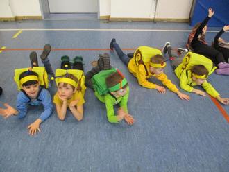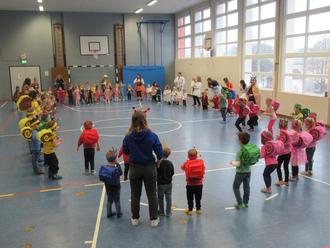 Ein besonderes Highlight war das gemeinsame Feiern in der Schulturnhalle. Zwei Stunden lang verwandelte sich diese in eine große Faschingsarena. Ob beim klassischen Eierlauf, beim schwungvollen Luftballontanz oder beim fröhlichen Schlag auf die Pinata-Figur – überall waren lachende Gesichter zu sehen. Die Erzieherinnen hatten mit viel Engagement und Liebe zum Detail zahlreiche Spiele vorbereitet und sorgten für einen reibungslosen Ablauf.