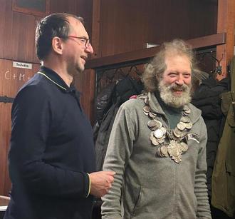 Schützenmeister Hans Leipold (rechts) ist auch der Schützenkönig 2026 der Tell-Schützen Spielberg. Sportlicher Leiter Martin Völkl gratuliert.