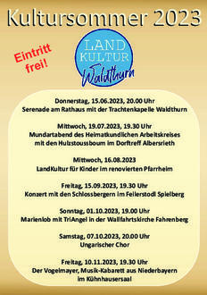 Die Mitglieder des Marktgemeinderates stimmten auf Antrag von Bürgermeister Josef Beimler der Weiterführung von LandKultur Waldthurn zu und stellten einen Betrag von ca. 5.000 Euro zur Verfügung. Dritter Bürgermeister Hans-Peter Reil hatte sich im Vorfeld bereits mit dem Steuerungsausschuss „LandKultur“ beraten und ein vorläufiges Programm zusammengestellt. Die Zuschussmaßnahme ist allerdings endgültig beendet. Der Markt kann daher nicht mehr so aus dem Vollen schöpfen, wie in den letzten Jahren gewöhnt. Bei sparsamem Einsatz der bewilligten Mittel kann trotzdem wieder ein interessantes Programm geboten werden. Das vorläufige Programm wurde wieder von Josef Forster aufbereitet. Leider fiel das Printz-Festival den geschrumpften Mitteln zum Opfer. Vielleicht bietet sich im Laufe des Jahres noch eine kleinere klassische Serenade an. Alle Veranstaltungen sind Eintritt frei. Spenden zur Förderung von weiteren LandKultur-Projekten werden gerne angenommen. „Wir würden uns sehr freuen, wenn wir wieder zahlreiche Gäste bei unseren Veranstaltungen begrüßen dürften. Für Anregungen oder Veranstaltungsvorschläge wären wir dankbar“.