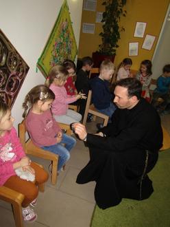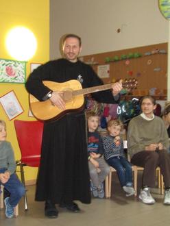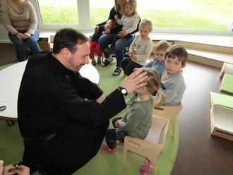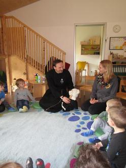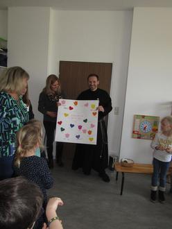 Am Freitag, den 15. März 2024 besuchten Pater Dominikus und Laienmissionarin Lucia Römisch unsere Einrichtung. Mit Freude und Neugier bereiteten sich die Kinder in den einzelnen Gruppen auf den Besuch vor. In der Raupengruppe verkleidete sich der Bär „Bruno“ mit den Kindern als Freund Jesu in der Ordenstracht der Passionisten. Pater Dominikus wurde mit seiner Begleiterin in jeder Gruppe im Sitzkreis herzlich empfangen und brachte den Kindern mit Leichtigkeit und Humor die Freundschaft mit Jesus näher. Es wurden Lieder gesungen und die Symbole der Pfarrmission „Sonne, Kreuz und Herz“ erklärt. Bevor jedes Kind einen persönlichen Segen erhielt, bekamen alle ein Freundschaftsarmband zum Zeichen, dass wir jetzt alle Freunde von Jesus sind. Zum Dank überreichten die Vorschulkinder den Besuchern eine Collage mit der Ausschrift „Schön, dass du da bist.“