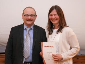 Karl Herrmann dankt Manuela Grünauer für ihre „Tätigkeit in der Kinder- und Jugendchorleitung“.