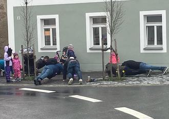 Sportliche Aufgaben - hier zehn Liegestützen - müssen die Väter bei der Vater-Kind-Rallye am Bürgersteig vor dem Physiocenter erfüllen.