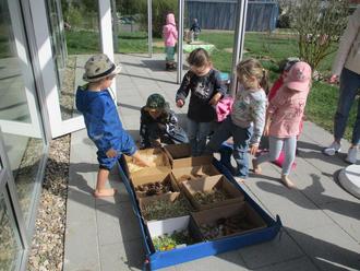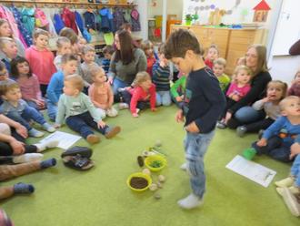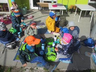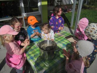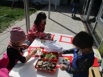Am zweiten Tag machten wir zusammen ein Picknick im Garten des Kindergartens. Die restliche Zeit verbrachten wir dann auch im Garten. Dort waren verschiedene Stationen aufgebaut. Beim Dosenwerfen mit Tannenzapfen konnten die Kinder ihre Zielsicherheit beweisen. Blumensamenbomben wurden mit den Kindern zusammen hergestellt, um sie später einzupflanzen. Die Natur fühlen konnten die Kinder mit ihren Füßen und Händen durch den aufgebauten „Fühlpfad“. Erde, Heu, Stroh, Steine, Sand und Kiefernzapfen – alles fühlte sich unterschiedlich an.