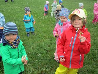 So wurden im Kindergarten zum Thema „Wiesentage“ verschiedene Aktionen und Angebote vorbereitet. Zu Beginn besuchten uns die Kinder der Krippe. Alle sangen gemeinsam zum Einstieg ein Wiesenlied, das Erzieherin Vanessa Bäumler vorbereitet hatte. Durch verschiedene Naturmaterialien wie Gras, Blumen, Erde und Steine konnten die Kinder erraten, dass diese Materialien alle auf der Wiese zu finden sind. Bei der anschließenden Freispielzeit hat jede Gruppe Naturmaterialien zum Spielen und Experimentieren angeboten. Nach der gemeinsamen Brotzeit haben wir uns alle auf den Weg gemacht, um auf einer Wiese verschiedene Pflanzen zu sammeln und Blumen zu pflücken. Voller Stolz brachten die Kinder ihre Funde zu uns Erziehern und sammelten alles in einem Korb. Im Kindergarten zurück, gestalteten die Kinder einen Bilderrahmen mit den gesammelten Pflanzen und Blumen.