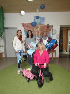 Mit leuchtenden Augen nahmen sie eine umfangreiche Spielzeugspende entgegen - bestehend aus Bobbycars und Laufrädern sowie Sandspielsachen. Von der „Schattenseite des Fahrenberges“ besuchten uns Cornelia Völkl und Jaqueline Kleber vom ambulanten Pflegedienst und Tagesstätte „Herbstsonne“ aus Pleystein. Die „Herbstsonne“ beliefert unsere Einrichtung schon seit vielen Jahren mit leckerem, kindgerechtem Mittagessen.