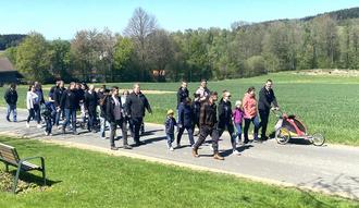 Die Spielberger Feuerwehr machte sich bei strahlendem Sonnenschein auf den Weg zur Waldthurner OWV-Skihütte an der Neuenhammerstraße auf. Unter der Leitung ihres Vorsitzenden Thomas Schwab wanderten rund 35 Kinder, Frauen und Männer knapp 6 Kilometer quer durch die idyllischen Felder, Wiesen und Wälder und passierten dabei auch die Luhe-Quelle.