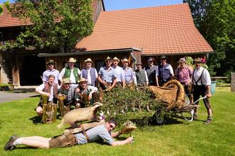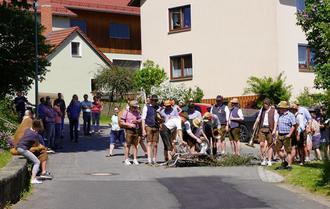 Die Begleiter forderten vor jedem Haus den Pfingstschwanz auf, im Takt der Musik von Joni Kraus, Konsti Stahl und Maxi Steiner sowie den schnalzenden mitgeführten Goisln, feuchtfröhlich zu tanzen.