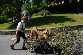 Der Pfingstschwanz, der am Morgen nicht aus den Federn gekommen war, wurde mit dem Mistkarren und einem Jutesack übergestülpt durch das Dorf gesteuert und vor jedem Haus vom geschmückten Mistgefährt geworfen.