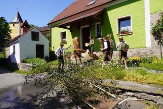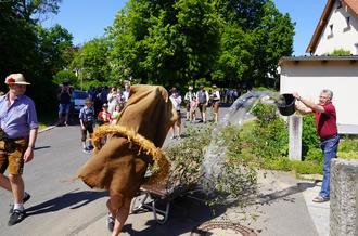 Der komische, unbekannte Geselle tanzte am Pfingstmontagnachmittag vor den Häusern im schönen Dorf Lennesrieth und wurde oberdrein mit Wasser aus Eimern bestraft.