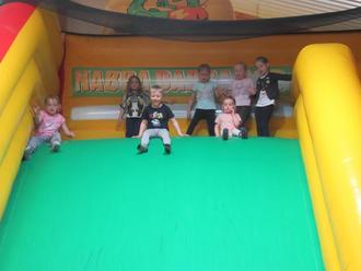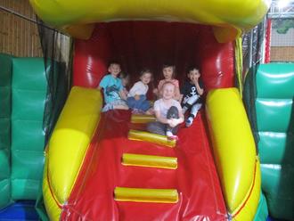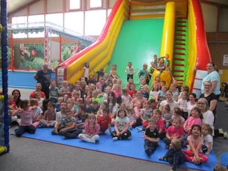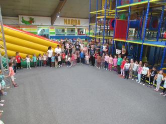 Gemeinsam bestiegen sie die Luftrutsche, das große aufblasbare Krokodil, hüpften auf dem Trampolin oder suchten sich einen Weg durch das riesige Kletterhaus. Einige Kinder sowie auch die Krippenkinder spielten im Bällebad.