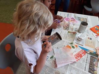Die „3 von der MITTI“ – Annette Füßl, Christine Hörig und Tanja Pflaum – hatten im Vorfeld schon alles vorbereitet. Für die geplante Muttertagsüberraschung hatten sie sich überlegt, eine leere Dose als Blumentopf mit Serviettentechnik zu gestalten. Für jedes Kind stand also eine Dose parat, auch verschiedene Servietten, Moosgummi, der passende Kleber und Pinsel lagen bereit.
