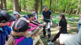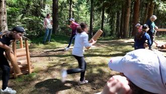Bei der Ratestaffel musste im Sprint erkannt werden, um welchen Baumzweig es sich handelt. Spaß hatten die Kinder auch beim Zapfenzielwurf aus fünf Meter Entfernung und beim Dachstuhlbau aus einem Holzbalken-Durcheinander.