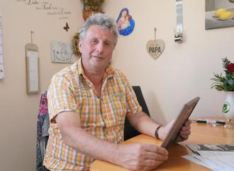 Max Müllner erinnert sich am heimischen Küchentischbei alten Bildern an 50 Jahre „Aktives Singen“.