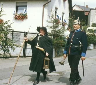 Max Müllner (rechts) als Gemeindediener mit Max Müller den Nachtwächter unterwegs