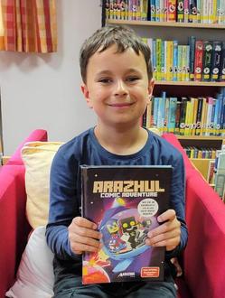 Er liest das Buch „Arazhul – Comic Adventure“. Dabei wird auf intergalaktische, abenteuerliche Weise beschrieben, wie ein kaputtes Raumschiff aus weit entfernten Welten nach Hause gebracht wird.