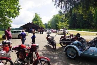 Die etwas in die Jahre gekommenen Motorräder und Fahrzeuge der tschechischen „Sascha-Kolowrat-Fahrt“ waren im tschechischen Diana gestartet. Sie fuhren über die Grenze nach Waidhaus – weiter Richtung Neuenhammer und mussten sie sich über den „Neuenhammerer Berg“ schon etwas plagen. Da tat eine Pause an der Waldthurner OWV – Skihütte an der Neuenhammerstraße schon gut. Josef Arnold fungierte für die ca. 35 Motorräder und 40 Autos als Einweiser und die fleißigen OWV – Leute um Vorsitzenden Roman Bauer sorgten sich um das leibliche Wohl der Teilnehmer.