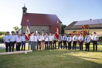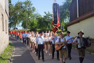 Am Dorfeingang von Spielberg - beim Wirtsheiner - nahmen die Neudorfer zusammen mit ihren Freunden von der Feuerwehr Altenhammer Aufstellung und Schwung. Pünktlich am Samstagabend um „Sechse“ marschierten sie unter den Klängen der „vom Grenzland mitgebrachten“ Mittelberg - Musikanten in die Dorfmitte, zuversichtlich aber trotzdem etwas aufgeregt, ob die Spielberger ihrer Bitte, die Patenschaft für ihr Jubiläum annehmen würden.