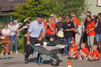 Schließlich ging es zum Showdown und die Spielberger hatten sich ein sehr unterhaltsames Spiel einfallen lassen: Für besondere Heiterkeit sorgte ein Wettbewerb mit Schubkarren, Helmen. Für Spielberg fuhr Andreas „Schneidi“ Schmid einen Schubkarren, in dem Josef „Seppe“ Stangl samt Einsatzanzug und Feuerwehrhelm mit einem aufmontierten Becher saß. Das gleiche Spiel ging an die Neudorfer, es fuhr Markus Zetzl und Alexander Pilfusek musste mit dem Becher ebenfalls einen Maßkrug befüllen. Der Spaß war groß – die Abkühlung bei heißem Wetter garantiert und die Spielberger hatten im doch oft ungleichem Spiel den Krug schneller voll, was aber keinerlei Bedeutung hatte.