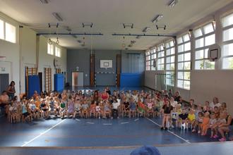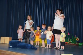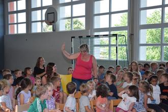 Als große Überraschung durften die Kinder der 1. Klasse der Grundschule Waldthurn, die von Lehrerin Anna Hoover begleitet wurden, beim Aktionstag und den Auftritten in der Turnhalle dabei sein. Mit großer Begeisterung verfolgten die jungen Zuschauer die Darbietungen der Krippengruppen und Kindergartenkinder. Die angehende Erzieherin Carina Bauer begrüßte alle und führte mit launigen Worten durch das Programm. Die Krippengruppen bezauberten das Publikum mit den Liedern „Guten Morgen, Guten Morgen“ und „Aber Griass Di“. Die Kindergartenkinder traten in Gruppen auf die Bühne und zeigten ihr Können mit abwechslungsreichen Liedern und Tänzen.