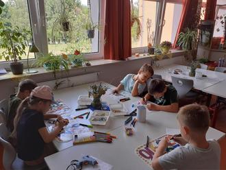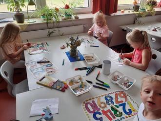 In zwei Gruppen aufgeteilt machten sie sich am Vormittag mit Erzieherin Tanja Pflaum auf den kurzen Weg zu den Räumen der MITTI. Ganz fremd waren diese den Kindern nicht, da sie ja bereits während der Sanierungsphase in der Krippe die Zimmer während der Musikalischen Früherziehung und Tschechisch kennengelernt hatten. Im kombinierten Ess- und Spielzimmer wurden die künftigen Grundschüler bereits von Annette Füßl erwartet. Sie hatte auf einem der Tische Bastelmaterial vorbereitet, das die Kinder natürlich sofort entdeckten. „Was machen wir denn?“, wollten sie auch gleich wissen. Gemeinsam wurden dann Hausschuhklammern mit Namen versehen, bemalt und beklebt – jeder so wie er wollte.