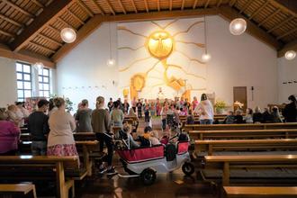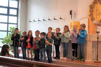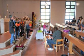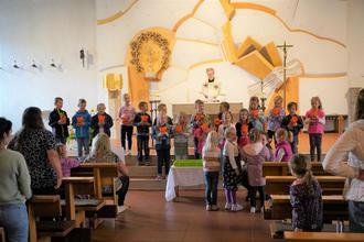 Es herrschte ein besondere Stimmung im Gotteshaus, die Mädchen und Buben verbreiteten einen angenehmes, wohltuendes Gemurmel und waren doch sehr auf das, was sich im Altarraum abspielte, fokussiert. Kinderwägen und Transportwägen der Kinderkrippe für die Kleinsten prägten an diesem Tag das Geschehen. „Für Gott ist keiner zu groß oder zu klein“ stellten die Vorschulkinder zusammen mit Pfarrer Norbert Götz fest.
