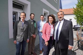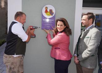Anschließend brachte Kaniber am Markplatz die Tafel des europäischen Dorferneuerungspreis 2022 Waldthurn in Silber – Brücken bauen - am Haus der Physiozeitpraxis von Thomas Bauer an. Waldthurn hatte hierbei Bayern für diesen Wettbewerb erfolgreich vertreten.