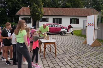 Schlauchkegeln, Kübelspritzen und Sackerlwerfen waren angesagt. Die Familiengruppe des Landvolks und das „Junge Landvolk“ mit Silvia Stahl und Barbara Stahl und ihrem Team leiteten die Schülerinnen und Schüler unter dem Motto „Schütteln bis der Butter kommt“, an.