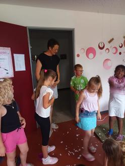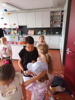 Bevor Christine den Aufenthaltsraum betreten durfte, hatten die Kinder den Raum mit Girlanden geschmückt. Als sie dann endlich ins Zimmer durfte, wurde sie mit einem Konfetti-Regen begrüßt. Anschließend musste Christine die Abschieds-Geschenke der Kinder suchen. Für einige der Kinder war es nicht einfach, sich von der beliebten Kinderpflegerin zu verabschieden und so flossen auch ein paar Tränen.