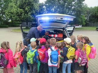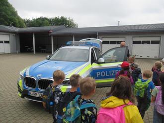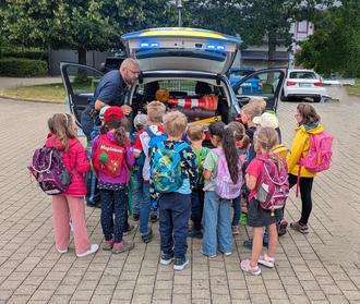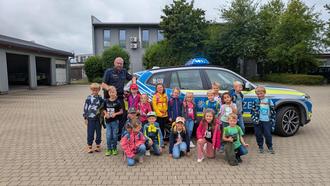 Das Aufregendste war für die Kinder das Erkunden der Polizeistation und besonders interessierte sie der Bereich, der nicht für alle zugänglich ist, z.B. die Arrestzelle. Viele Kindern trauten sich in die Zelle rein zu gehen. Jedoch hatten manche Kinder auch großen Respekt davor. Danach ging es schon zu den Polizeifahrzeugen. Die Vorschulkinder staunten darüber, was alles so in den Streifenwagen reinpasst. Das Blaulicht ist wie ein Magnet für alle Augen und bringt Respekt, erklärte der Polizeibeamte. So ein Besuch bei der Polizei soll dazu beitragen, dass die Kinder die Polizei als „Freund und Helfer“ sehen. Als kleine Erinnerung an diesen Besuch erhielt jedes Kind eine Mini-Polizeikelle. Mit einer Danke-Karte haben sich die Kinder bei POM Wolfgang Piehler bedankt.