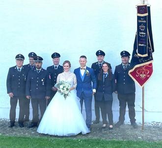 Selbstverständlich, dass die Spielberger Feuerwehr mit allen was Rang und Namen hat, dem Brautpaar nach der Trauung herzlich gratulierte.
